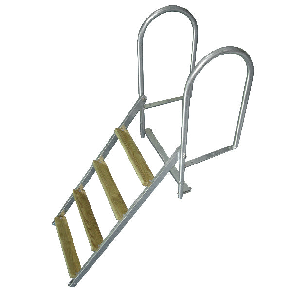 Fällbar bryggstege med 4 fotsteg av trä. Ramen är gjord av varmgalvaniserat stål. Förlängning: 1160245 (extra tillbehör)\n\nUndvik korrosion och galvanisk frätning av din bryggstege genom att montera en anod på metallrören som ska skyddas. Rostfritt stål (både AISI 304 och 316) är tyvärr också utsatt för galvanisk frätning. Lämplig anod är axelanod Ø: 32 mm art.nr. 1143324 som passar bra på stegarnas rördiameter.